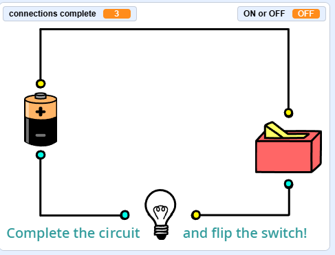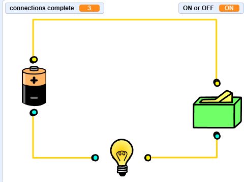 电路路径会根据开关状态和连接数量实时改变造型。当开关打开且所有三个元件都正确连接时,显示ON造型(通电状态),否则显示OFF造型(断电状态)。
